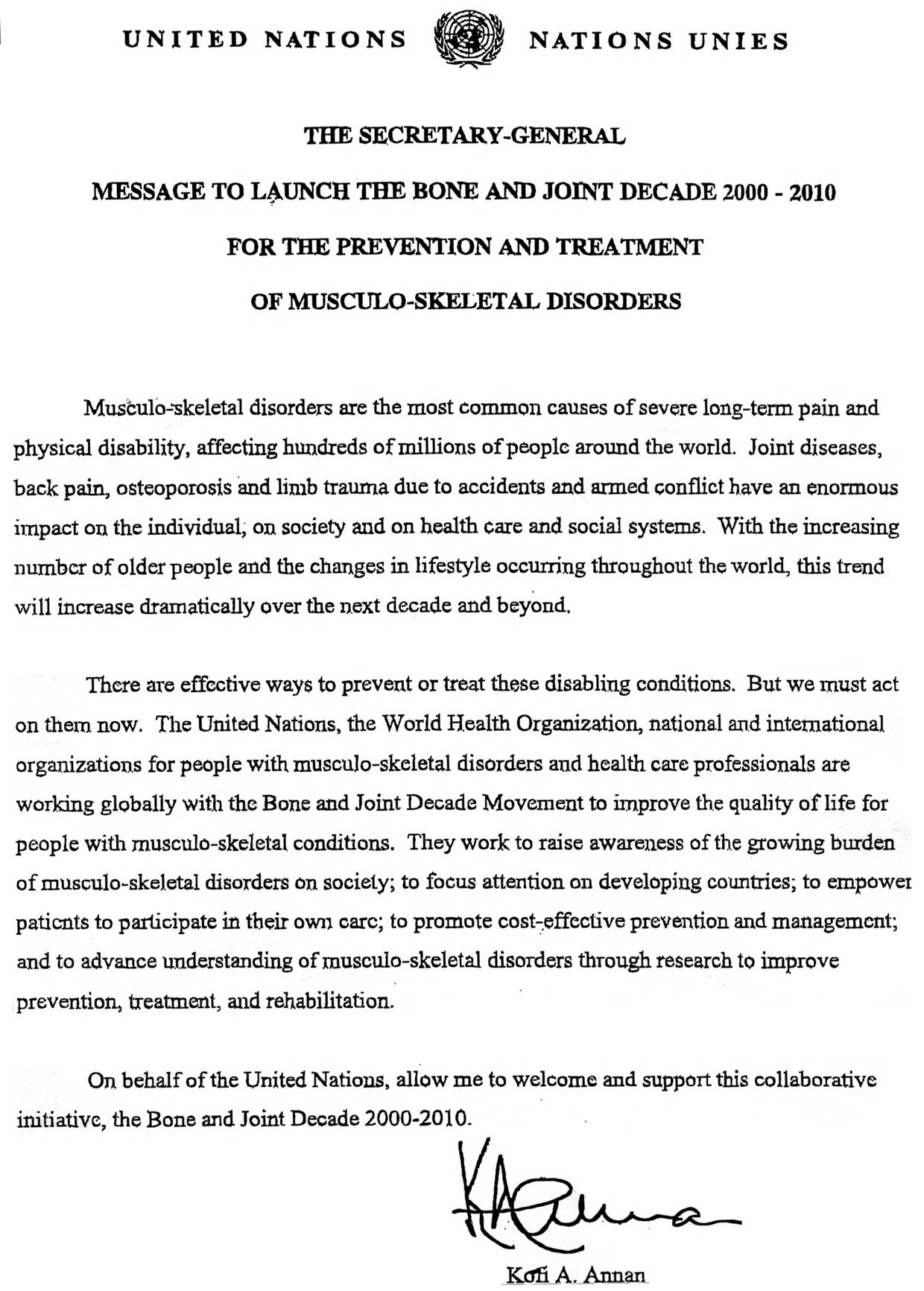 I commend the many volunteer, professional, and patient advocacy organizations who are devoting their time and energy to increasing awareness of the seriousness an widespread impact of muskuloskeltal diseases and injuries. Through your efforts to improve prevention, treatment, and rehabilitation, your commitment to research, and your participation in a variety of bone and Joint Decade activities, you are bringing hope to countless people around the world an helping to create a brighter, heathier future for us all.