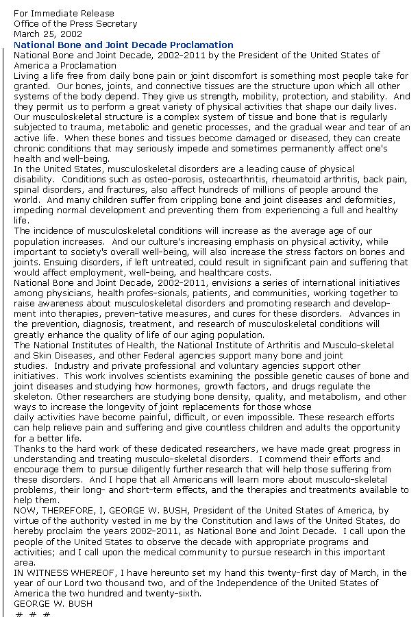 "NOW, THEREFORE, I, GEORGE W. BUSH, President of the United States of America, by virtue of the authority vested in me by the Constitution and laws of the United States, do hereby proclaim the years 2002-2011, as National Bone and Joint Decade. I call upon the people of the United States to observe the decade with appropriate programs and activities; and I call upon the medical community to pursue research in this important area.