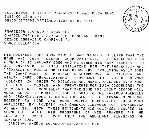 "His holiness pope John Paul II send his warm greetings to all involved in this initiative to discover and make available even more effective remedies and treatments for such disorders to bring the benefit of advanced medical science to more an more people afflicted by endemic diseases (Evangelium vitae, 26). With this sentiments his holiness assures all connected with this programme of his prayers and he cordially involves upon them the abundance blessing of almighty god."